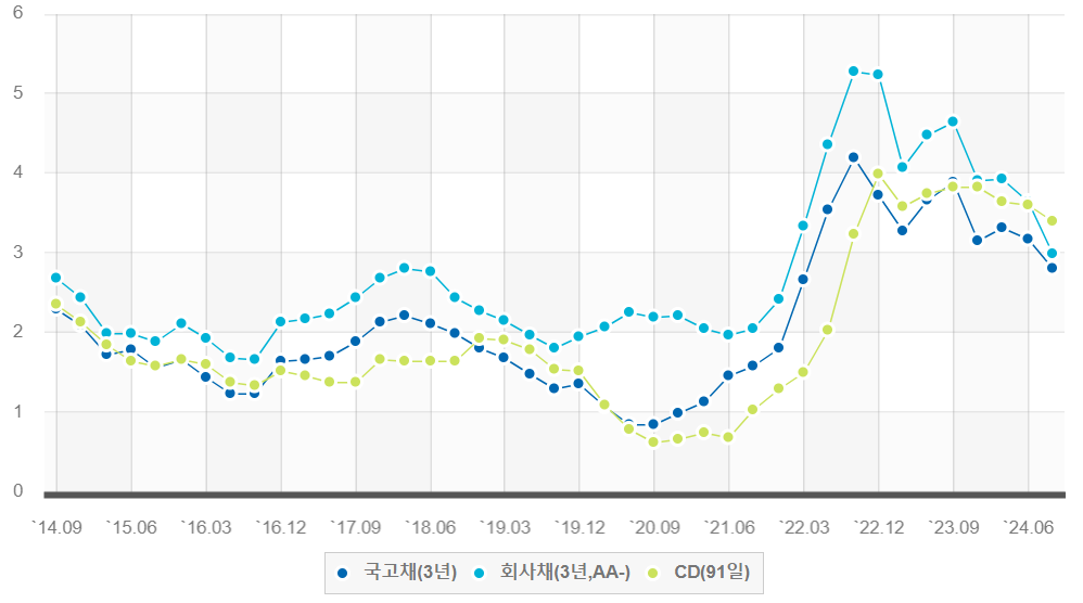 | 항목 | 한국:국고채(3년) | 한국:회사채(3년,AA-) | 한국:CD(91일) |