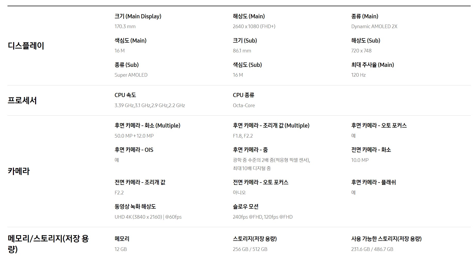 👉메인디스플레이 스펙: 170.3mm, Dynamic AMOLED 2X, 16M 색심도, 120Hz최대 주사율, 해상도-2640 X 1080 (FHD+), 최대 2,600nits