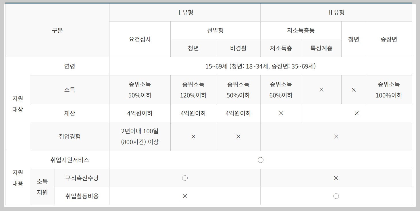 가구단위의 중위소득이 60%이하이고 재산 4억원(15세~37세 청년은 5억원) 이하면서, 최근 2년 안에 100일 또는 800시간 이상의 취업경험이 있는 사람을 대상으로 해요