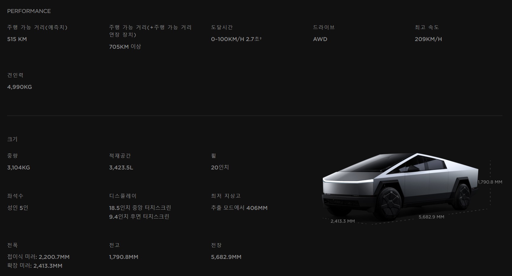 사이버트럭 제원 정보