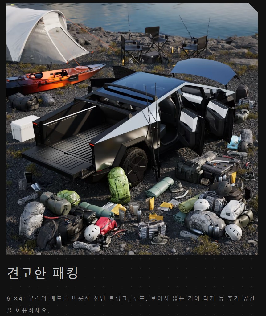1,134Kg의 적재량 4,990Kg의 견인력은 이 차가 정말 작정하고 만든 차라는 것을 보여주죠. 다시 한번 말씀드리지만 사이버트럭은 전기차입니다. 전기차가 이런 적재량과 견인력을 보여준다는 건 정말 대단한 것 아닌가요?